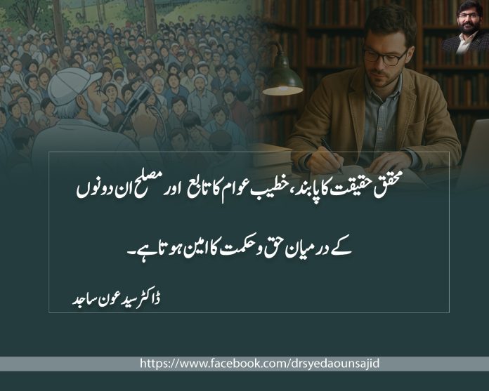 ایک محقق، تحقیقی کتب و مصادر کے ساتھ چلتا ہے۔ حقیقت اس سے مخاطب ہوتی ہے۔ یعنی وہ حقائق پر نظر رکھے ہوئے ہوتا ہے۔تحقیق و دلیل اسے جس طرف لے جائیں اس طرف جاتا ہے۔ اسے عوام کی پسند و ناپسند سے کچھ لینا دینا نہیں ہوتا۔