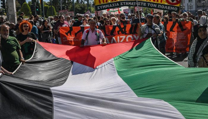 غیر ملکی میڈیا کے مطابق فلسطین حمایت مارچ میں شریک سیکڑوں مظاہرین نے یونانی حکومت سے اسرائیل کے ساتھ تعلقات منقطع کرنے کا مطالبہ کیا۔