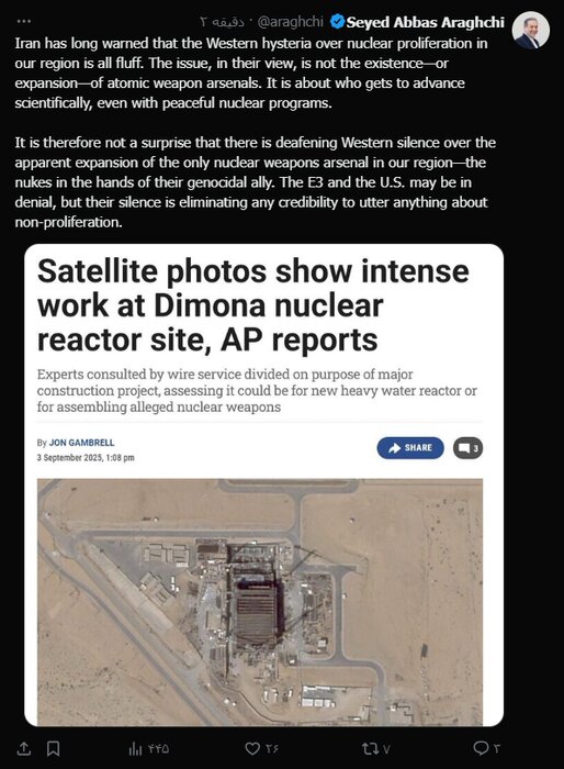 وزیر خارجہ سید عباس عراقچی نے سوشل نیٹ ورک ایکس پر لکھا ہے کہ  ایران نے ہمیشہ خبردار کیا ہے کہ خطے میں جوہری ہتھیاروں کی توسیع کے بارے میں مغرب کا ہسٹیریا مکمل طور پر مصنوعی ہے۔