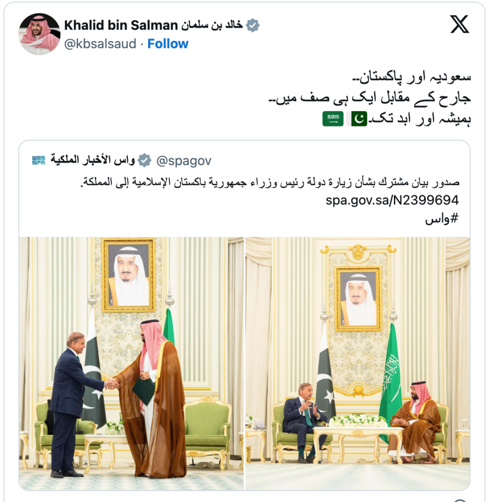 دونوں ممالک کے درمیان ہونے والے اس تاریخی معاہدے کے بعد سعودی وزیر دفاع خالد بن سلمان نے سوشل میڈیا سائٹ ایکس پر بیان جاری کیا۔