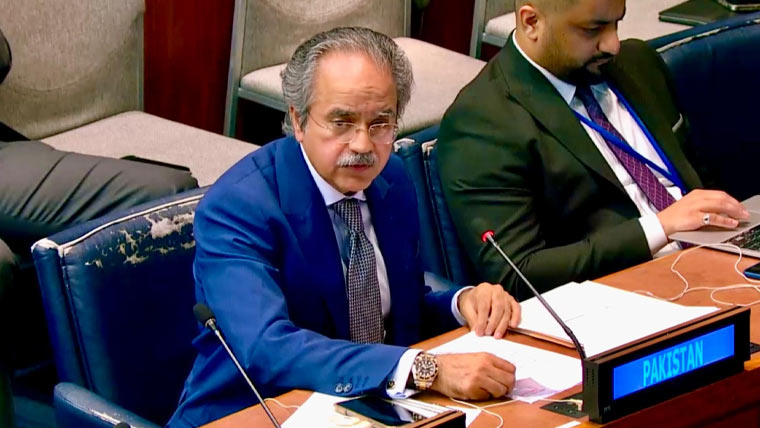 پاکستانی مندوب نے بھارتی زیر قبضہ جموں و کشمیر میں انسانی حقوق کی خلاف ورزیوں پر شدید تشویش کا اظہار کرتے ہوئے کہا کہ یہ تنازع اقوام متحدہ کے ایجنڈے پر سب سے پرانا حل طلب مسئلہ ہے، سلامتی کونسل کی قراردادیں واضح طور پر ایک غیر جانبدارانہ رائے شماری کے ذریعے مسئلہ کشمیر کے حل کا تقاضا کرتی ہیں، جسے بھارت مسلسل نظرانداز کر رہا ہے۔