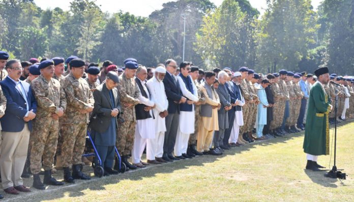 آئی ایس پی آر کے مطابق نماز جنازہ میں وفاقی وزرا، گورنر خیبر پختونخوا، سول و عسکری حکام اور عوام کی بڑی تعداد نے شرکت کی۔